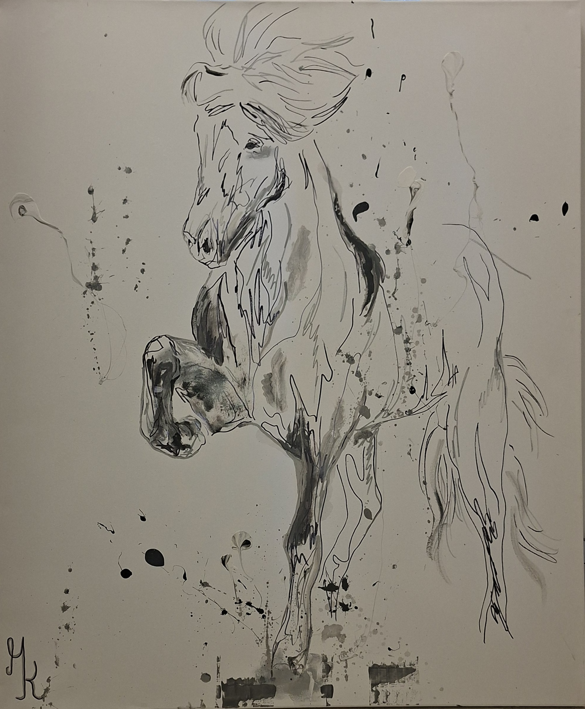 Die Bildidee verknüpft Natur und Erinnerung, Gegenwart und Geschichte: Der Betrachter stolpert nicht über klare Erklärungen, sondern wird eingeladen, zu sehen, zu fühlen und eigene Geschichten zu entdecken. Das Islandpferd scheint in dieser Szene eine Brücke zu schlagen – zwischen dem abstrakten Farbrauschen und den konkreten Formen eines Tieres, das Robustheit mit Zartheit vereint. Die Mischung aus Schwarz und Weiß steht hier symbolisch für Gegensätze, die in Harmonie koexistieren: Nacht und Tag, Ruhe und Bewegung, Stabilität und Wandel. Das Bild von Mira Karmann fängt damit eine visuelle Impression, die man langsam in sich aufnehmen möchte, ohne sich gedrängt zu fühlen, sofort eine Bedeutung festzulegen.